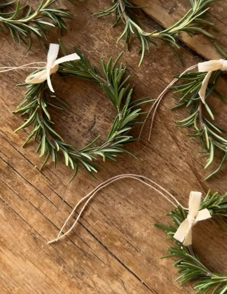 Rosemary from the garden makes a lovely mini wreath that smells good and can be used as an ornament or as part of garland.