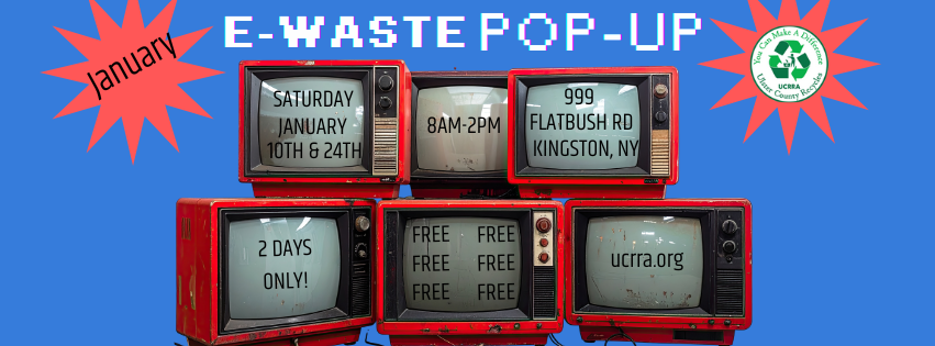 The UCRRA will be hosting two, one-day only, FREE Electronics Recycling pop-up events on Saturday, January 10th 2026 and Saturday, January 24th, 2026. These events will take place in the parking lot adjacent to the Main Office, at 999 Flatbush Road, Kingston, NY 12401, from 8 AM to 2 PM.