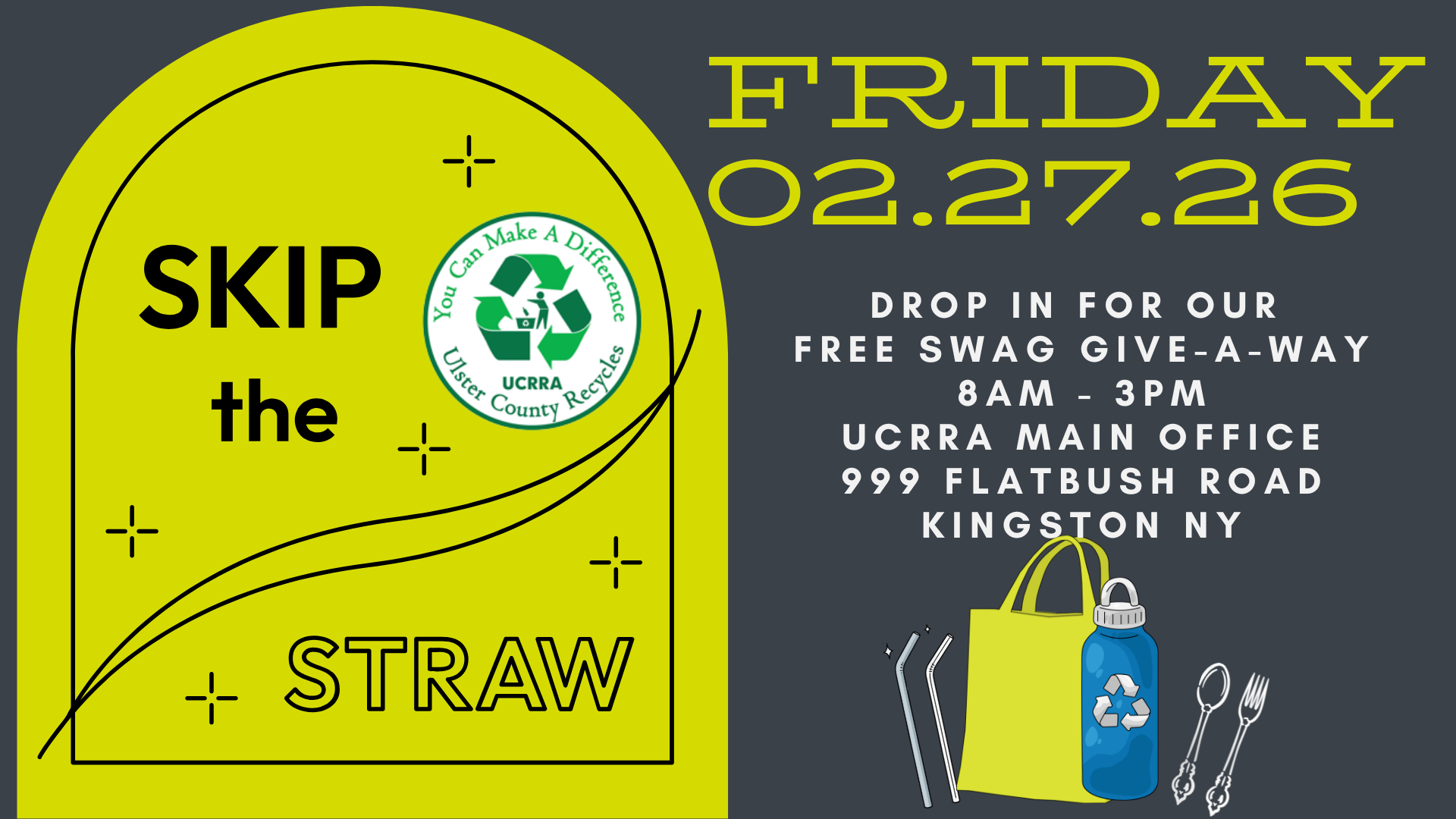 We’re celebrating National Skip the Straw Day with a free swag give-a-way! Stop by the UCRRA Main Office on Friday, February 27th to claim a free, reusable, stainless steel gift, compliments of the Recycling Outreach Team. We’ll have bottles, utensil kits, and straws to give away while supplies last. Limit 1 swag item per visitor. Grab a free item, browse our educational media in our front lobby and let us help you get one step closer to reducing single use disposable plastics.