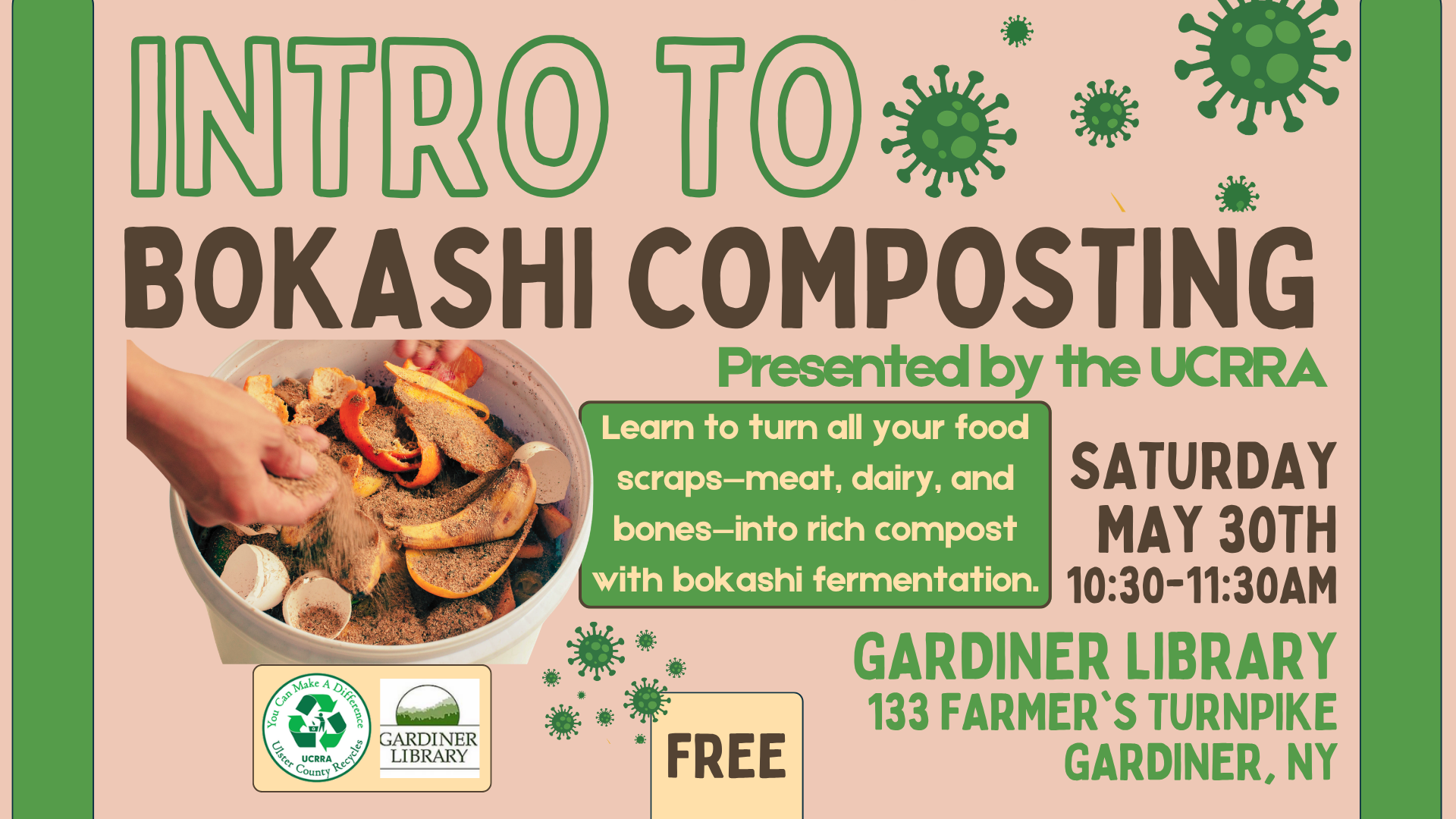 Intro To Bokashi Composting Saturday May 30th 2026 10:30am-11:30am Gardiner Library 33 Farmer's Turnpike Gardiner, New York Bokashi is a fermentation method that uses beneficial microbes to break down all food scraps—including meat, dairy, ..